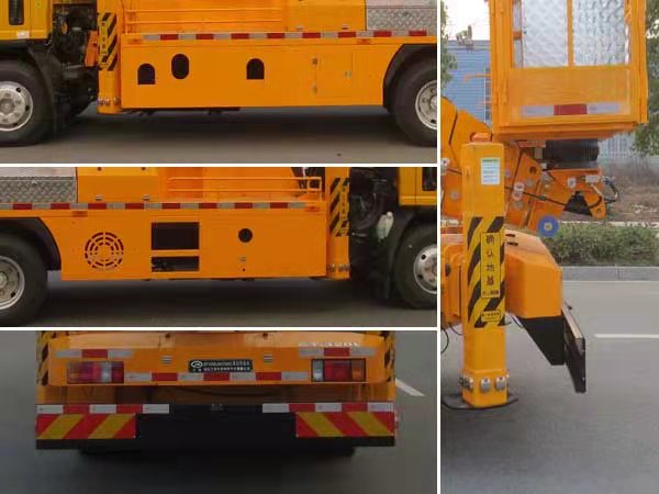 后伸320mm;侧面防护及后下部防护装置材料材质:Q235,侧面防护装置为整体式结构,后下部防护装置连接方式:焊接加螺栓连接,断面尺寸(宽×高):50×260(mm),离地高度:400mm;随底盘选装制动系统,油制动对应ABS及其控制器型号为:APG3550500A,生产厂家为:浙江亚太机电股份有限公司,仅与4KH1CN6LB型发动机匹配;气制动对应ABS及其控制器型号为:CM4XL-4S/4M,生产厂家为:广州瑞立科密汽车电子股份有限公司;主要专用装置为升缩臂,用于抢修电力、通讯、路灯等高空作业. |