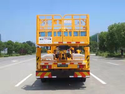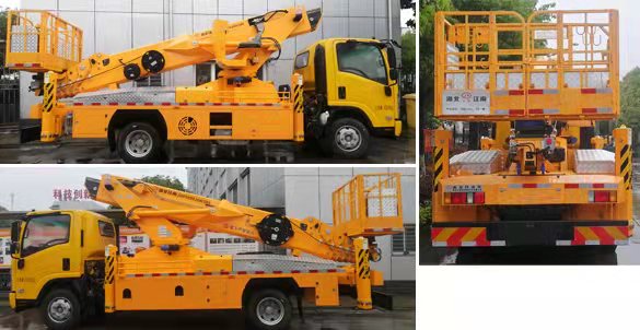 外形尺寸长/后伸对应关系(mm):7330/350,6980/无后伸;选装整车外观;侧面防护及后下部防护装置材料材质:Q235,侧面防护装置为整体式结构,后下部防护连接方式:焊接加螺栓连接,断面尺寸(宽×高):50×260(mm),离地高度:400mm;ABS及控制器型号为:APG3550500H1,生产厂家为:浙江亚太机电股份有限公司;主要专用装置为升缩臂,用于抢修电力、通讯、路灯等高空作业. |