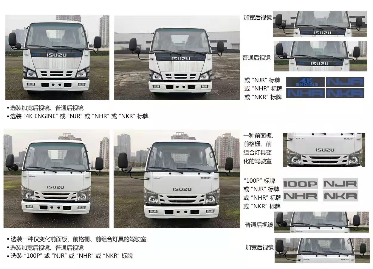 采用3815轴距单排五十铃1x级别可翻转100p或600p驾驶室,五十铃120马力,五档变速器,空调,方向助力,ABS,中控锁,电动玻璃,多功能液晶仪表,2.5吨前桥4.8吨后桥,700R16胎,断气刹,该底盘可选装液压制动或气压制动,选装一种仅变化前面板,前格栅,前组合灯具的驾驶室;选装后视镜款式;选装前部标牌“4K ENGING/NJR/NHR/NKR/100P”;选装ETC车载装置;选装塑料脚踏板。