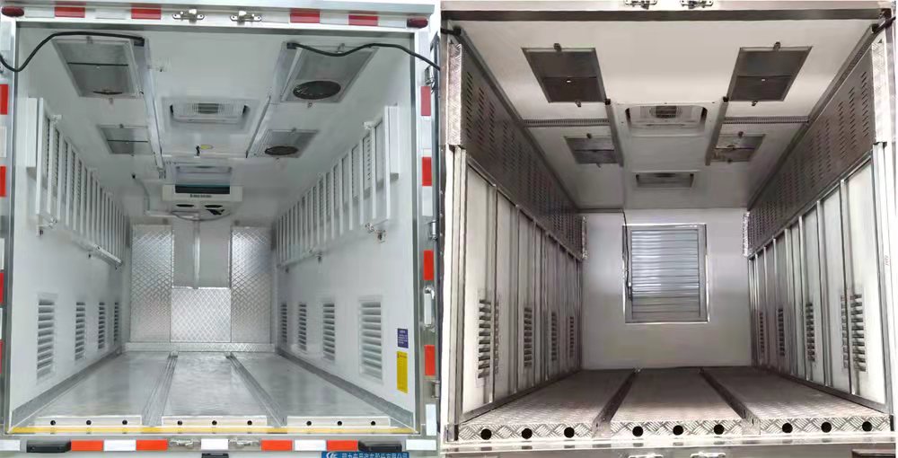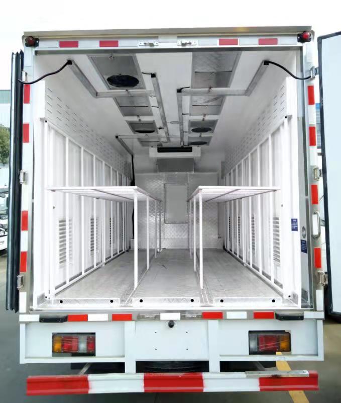 1.该车专用装置主要为通风保温式箱体,配备加热,空调系统,通风防水罩及排风扇,厢体两侧配备可封闭式百叶窗,车厢内部折叠货架放置雏禽盒,车厢地板配有导风槽,用于运输雏禽,顶部封闭不可开启;2.整车长/前悬/轴距/后悬对应关系为(mm):5995/1110(1120)/3365/1520(1510),5995/1110(1120)/3360/1525(1515);3.油耗申报值与发动机对应关系为L/100km:4KH1CN6LB/11.5,4KH1CN6HB/11.5;4.随底盘选装新型导流罩和侧导流板,选装原型导流罩;5.防护材料:Q235A碳钢,连接方式:左右侧面及后下部防护均采用焊接连接,后部防护断面尺寸(mm):120×50,后部防护离地高度(mm):420;6.该车随底盘底盘选装制动系统:装液压制动系统时,ABS及其控制器型号/生产企业对应关系为::APG3550500A/浙江亚太机电股份有限公司,CM4YL/广州瑞立科密汽车电子股份有限公司;装气压制动系统时,ABS及其控制器型号/生产企业对应关系为:CM4XL-4S/4M/广州瑞立科密汽车电子股份有限公司; 选装内部结构样式. |