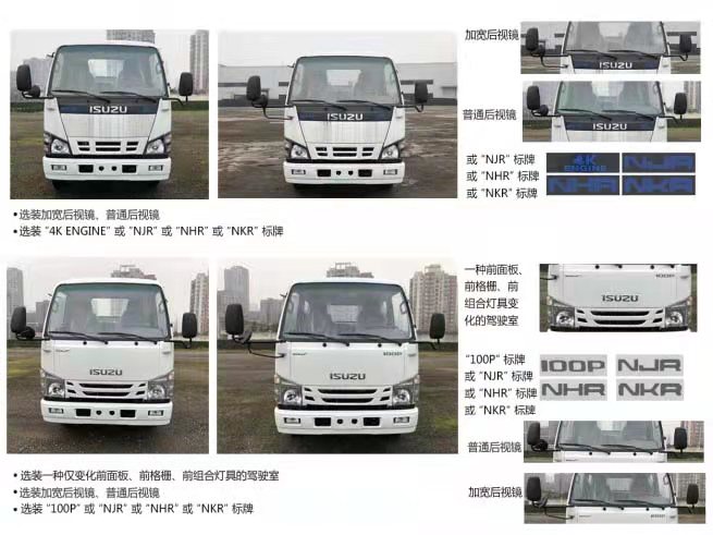 采用3360轴距单排五十铃1x级别可翻转100p或600p驾驶室,五十铃120马力,五档变速器,空调,方向助力,ABS,中控锁,电动玻璃,多功能液晶仪表,2吨前桥4吨后桥,700R16胎,可选装液压制动系统或气压制动系统;选装一种仅变化前面板、前格栅、前组合灯具的驾驶室;选装后视镜款式;选装前部标牌“4K ENGING/NJR/NHR/NKR/100P”;选装ETC车载装置;选装塑料脚踏板。