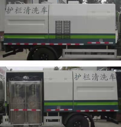 随底盘选装驾驶室,选装箱体外观及扫刷安装位置;侧防护装置采用铝合金6063,连接方式:螺栓连接;后下部防护装置材料材质:Q235,连接方式:焊接加螺栓连接;后下部防护装置断面尺寸(宽×高):50×100(mm),离地高度:440mm;随底盘选装制动系统:装液压制动系统时,ABS及其控制器型号/生产企业对应关系为::APG3550500A/浙江亚太机电股份有限公司,CM4YL/广州瑞立科密汽车电子股份有限公司;装气压制动系统时,ABS及其控制器型号/生产企业对应关系为:CM4XL-4S/4M/广州瑞立科密汽车电子股份有限公司;主要专用装置为罐体,清洗装置,用于护栏清洗作业。