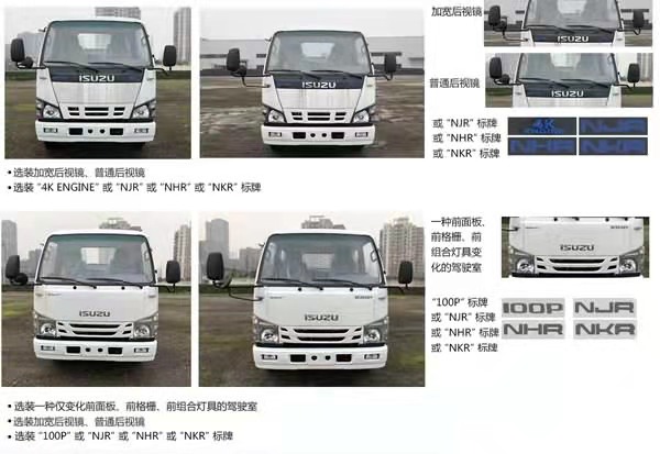 采用3360轴距单排五十铃1x级别可翻转100p或600p驾驶室,五十铃120马力,五档变速器,空调,方向助力,ABS,中控锁,电动玻璃,多功能液晶仪表,2.5吨前桥4.8吨后桥,700R16胎,可选装液压制动装置或气压制动装置;选装一种仅变化前面板、前格栅、前组合灯具的驾驶室;选装后视镜款式;选装前部标牌“4K ENGING/NJR/NHR/NKR/100P”;选装ETC车载装置;选装塑料脚踏板。