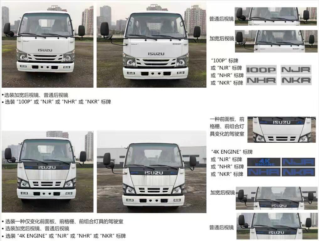 采用五十铃3815轴距双排五十铃1x级别可翻转100p或600p驾驶室,五十铃120马力发动机,五档变速器,空调,方向助力,ABS,中控锁,电动玻璃,多功能液晶仪表,2.5吨前桥4.8吨后桥,700R16胎,该底盘可选装液压制动系统或气压制动系统;选装一种仅变化前面板,前格栅,前组合灯具的驾驶室;选装后视镜款式;选装前部标牌“4K ENGING/NJR/NHR/NKR/100P”;选装ETC车载装置;选装塑料脚踏板。