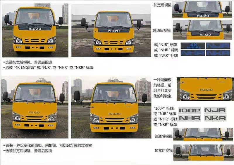 采用3815轴距双排五十铃1x级别不可翻转100p或600p驾驶室,五十铃120马力,五档变速器,空调,方向助力,ABS,中控锁,电动玻璃,多功能液晶仪表,2吨前桥4.8吨后桥,700R16胎,可选装液压制动装置或气压制动装置;选装一种仅变化前面板,前格栅,前组合灯具的驾驶室;选装后视镜款式;选装前部标牌“4K ENGING/NJR/NHR/NKR/100P”;选装ETC车载装置;选装塑料脚踏板。