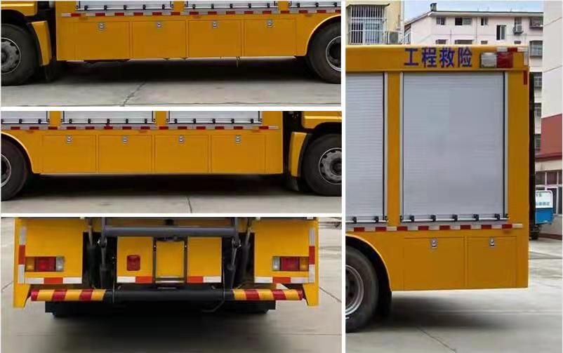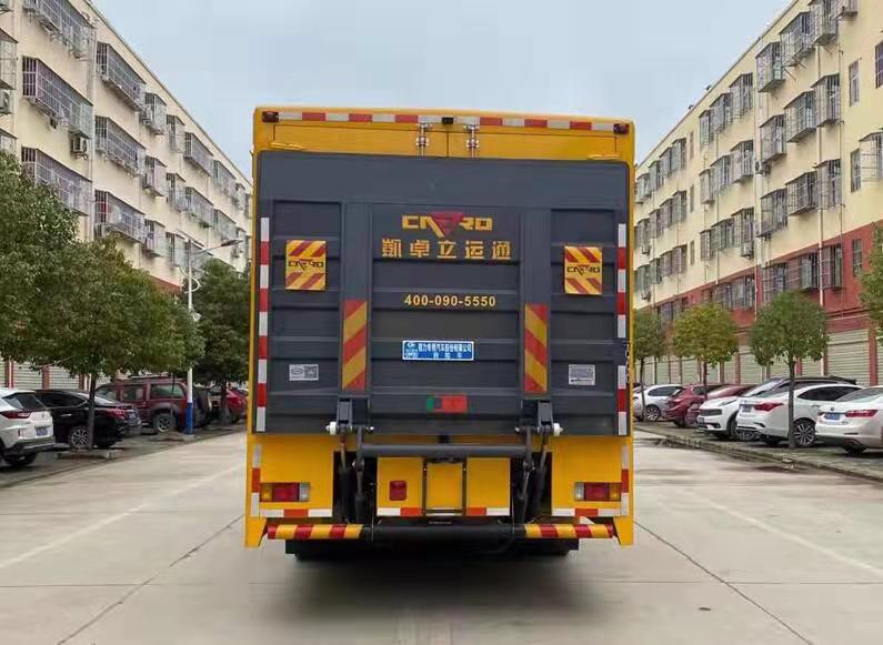 该车专用装置:装有静音车厢,发电机组,电缆卷盘,控制系统等;用于应急抢险,并具备移动电源功能,货架,用于装备器材和救援等专用设备;车厢顶部封闭且不可开启;整车长/轴距/后悬对应关系为(mm):9835/5550/2950,9535/5550/2650,8485/4500/2650,8185/4500/2350,7585/3900/2350,7285/3900/2050;侧防护由车身结构代替,后防护材质为Q235A碳钢,采用焊接加螺栓连接,断面尺寸为φ120mm,防护下边缘离地高500mm;尾板、上下坡道收起状态的水平长度(mm):295,尾板质量为540kg;选装限速装置,限速89km/h;ABS及控制器型号为:APG3550500H1,生产厂家为:浙江亚太机电股份有限公司;ABS控制器型号:ABS8.8 ECU 24V,生产厂家为:东科克诺尔商用车制动系统(十堰)有限公司. |