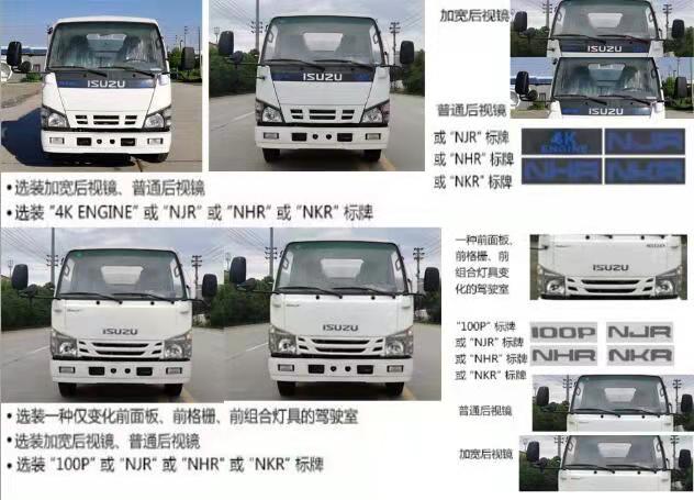 采用3360轴距单排五十铃1x级别可翻转100p或600p驾驶室,五十铃120马力,五档变速器,空调,方向助力,ABS,中控锁,电动玻璃,多功能液晶仪表,2.5吨前桥4.8吨后桥,700R16胎,可选装液压制动系统或气压制动系统;选装一种仅变化前面板、前格栅、前组合灯具的驾驶室;选装后视镜款式;选装前部标牌“4K ENGING/NJR/NHR/NKR/100P”;选装ETC车载装置;选装塑料脚踏板。