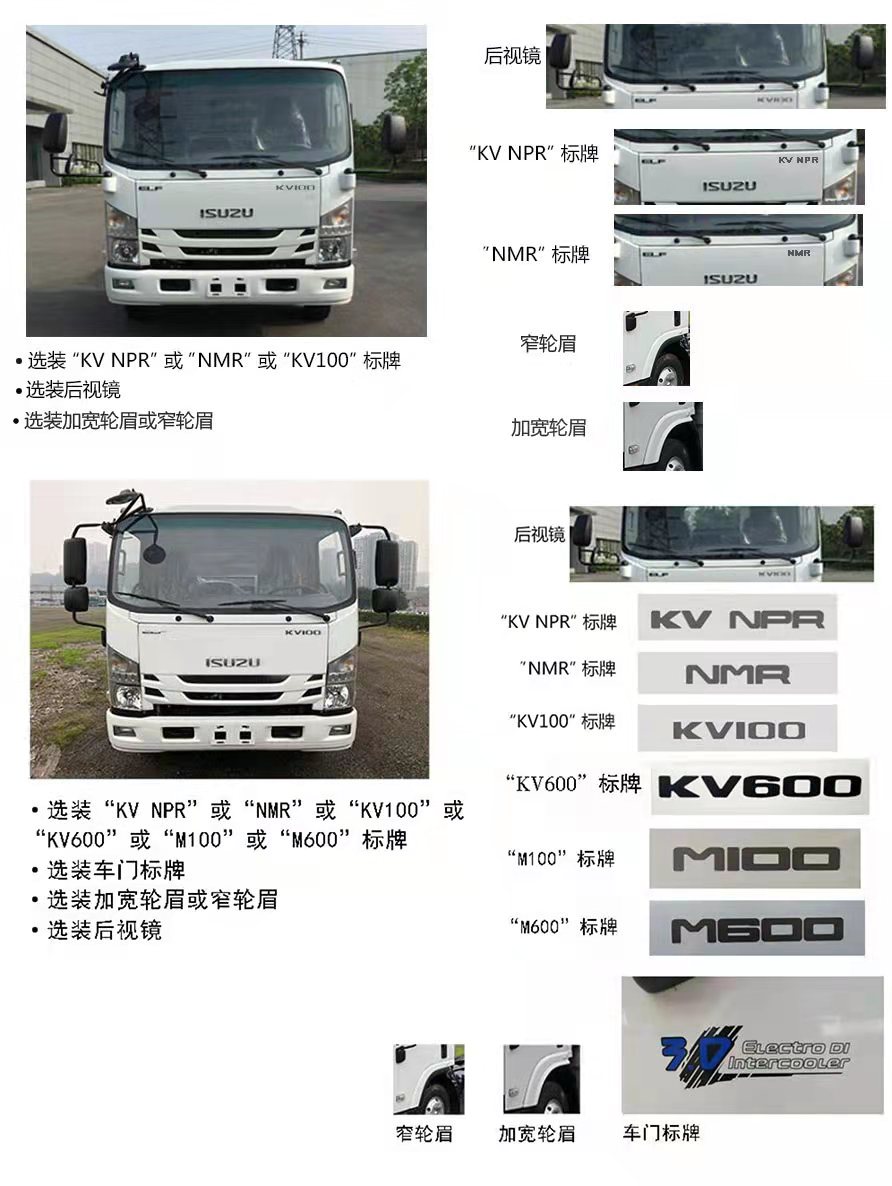 采用五十铃单排3x宽体KV系或2x中体M系可翻转驾驶室,五十铃120马力五档或132马力6档,空调,方向助力,ABS,中控锁,电动玻璃,多功能液晶仪表盘,3吨前桥5.5吨后桥,750R16胎,可选装液压制动系统或气压制动系统,选装镀铬角板、格栅,驾驶室后围盲窗,加宽轮眉,不同造型风格、不同材质(铝/铁)轮辋,“KV100"、"M100"、"KV600"、"M600"标牌,车门标牌;该车型可选装ETC车载装置。