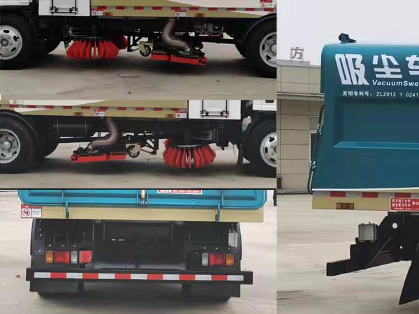 侧防护采由专用装置吸盘和扫刷代替;后防护装置材料为Q235,焊接连接,截面尺寸为:120×60(mm),离地高度为:400(mm);ABS型号/厂家:ABS及控制器型号为:APG3550500H1,生产厂家为:浙江亚太机电股份有限公司;电池种类/型号/生产企业:磷酸铁锂锂离子动力蓄电池/L202D02/宁德时代新能源科技股份有限公司;该底盘电机峰值功率为120kW,额定功率75kW;该车专用装置主要由水箱、风机、吸盘组成,用于路面吸尘作用. |