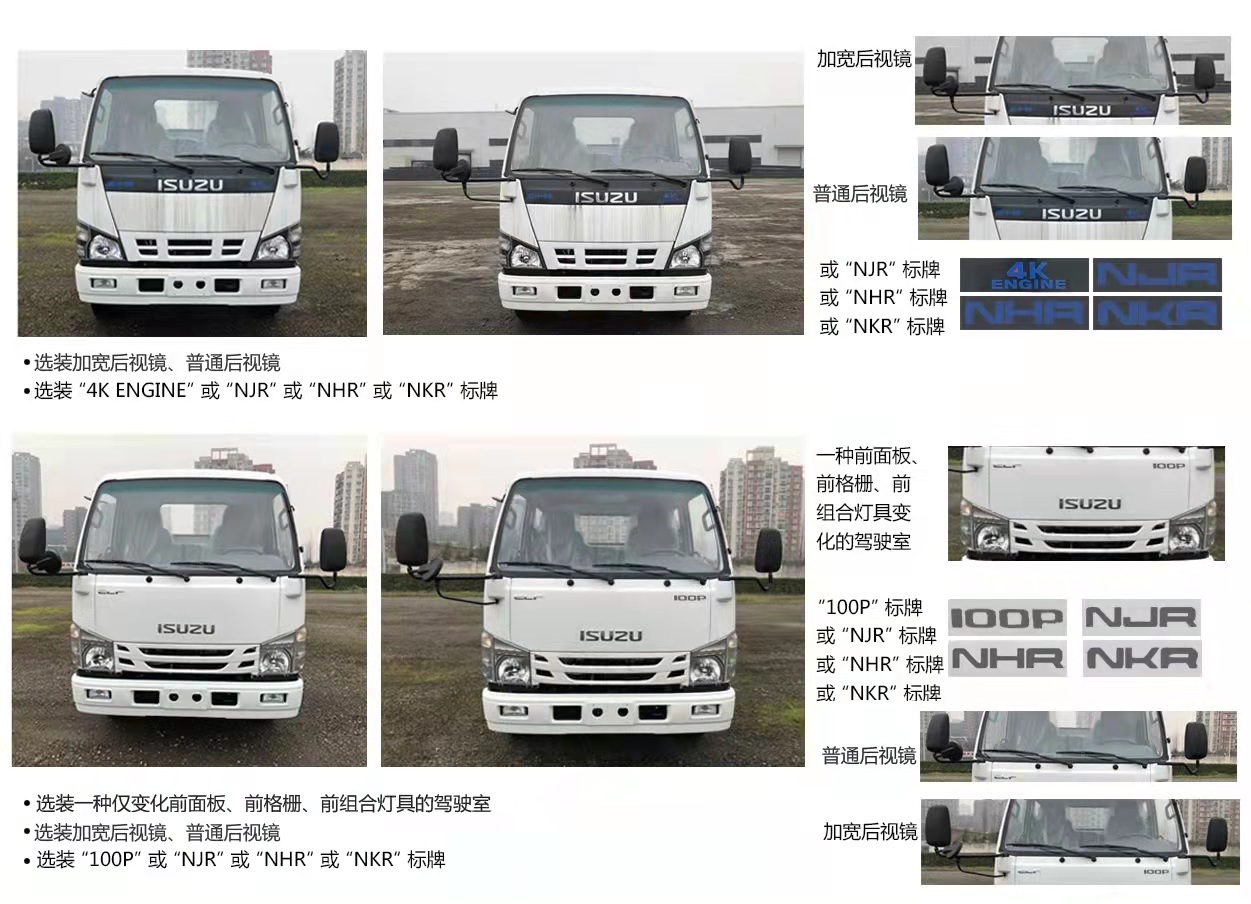 3815轴距单排五十铃1x级别可翻转100p或600p驾驶室,五十铃120马力发动机,五档变速器,空调,方向助力,ABS,中控锁,电动玻璃,多功能液晶仪表,2.5吨前桥4.8吨后桥,700R16胎,该底盘可选装液压制动系统或气压制动系统,选装一种仅变化前面板,前格栅,前组合灯具的驾驶室;选装后视镜款式;选装前部标牌“4KENGING/NJR/NHR/100P”;选装ETC车载装置;选装塑料脚踏板;