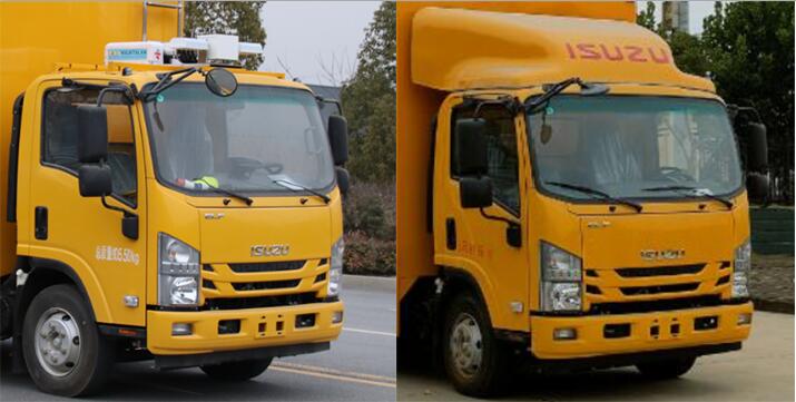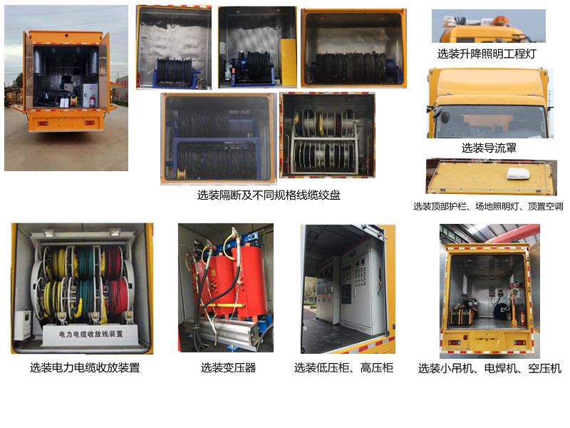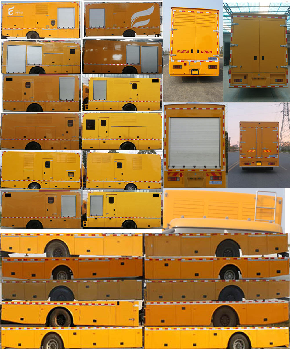 该车装备有电力配套设备,用于提供电源,车厢顶部封闭不可开启.侧防护由箱体代替,材料材质:Q235,后防护装置为加强式裙箱结构,材料材质为Q235,离地高度为455mm;该底盘装ABS;ABS及控制器型号为:APG3550500H1,生产厂家为:浙江亚太机电股份有限公司;选装箱体外观,整车长度与后悬对应关系为(mm):8225/2640,7800/2215.选装线缆卷盘,电缆收放装置,变压器,低压柜,高压柜,小吊机,电焊机,空压机,导流罩,升降照明工程灯,顶部围栏,场地照明灯,顶置空调及LED显示屏,选装不同驾驶室前脸及后视镜 |